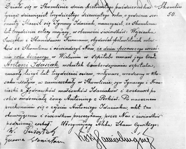 Fotokopia aktu zgonu zamordowanego w szpitalu w dniu 1 września 1939 r. |