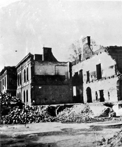 Ruiny Szpitala Wszystkich Świętych w Wieluniu po zbombardowaniu go przez lotnictwo hitlerowskie w dniu 1 września 1939 - widok od strony ul. obecnie 1-maja |