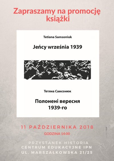 Centrum Edukacyjne IPN im. Janusza Kurtyki „Przystanek Historia” zaprasza na prezentację książki Tetiany Samsoniuk Jeńcy września 1939. Spotkanie odbędzie się 11 października (czwartek) o godz. 14:00 na Przystanku Historia, przy ul. Marszałkowskiej 21/25 w Warszawie. Na promocji będzie obecna autorka i tłumacz książki, a spotkanie poprowadzi dyrektor Biura Edukacji Narodowej IPN Adam Hlebowicz.