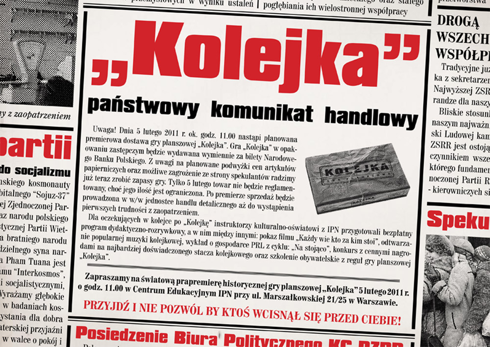Uwaga! Dnia 5 lutego 2011 r. w Centrum Edukacyjnym IPN przy ul. Marszałkowskiej 21/25 w Warszawie ok. godz. 11.00 nastąpi planowana premierowa dostawa gry planszowej „Kolejka”. Gra „Kolejka” w opakowaniu zastępczym będzie wydawana wymiennie za bilety Narodowego Banku Polskiego. Z uwagi na planowane podwyżki cen artykułów papierniczych oraz możliwe zagrożenie ze strony spekulantów radzimy już teraz zrobić zapasy gry. Tylko 5 lutego towar nie będzie reglamentowany, choć jego ilość jest ograniczona. Po premierze sprzedaż będzie prowadzona w w/w jednostce handlu detalicznego aż do wystąpienia pierwszych trudności z zaopatrzeniem.