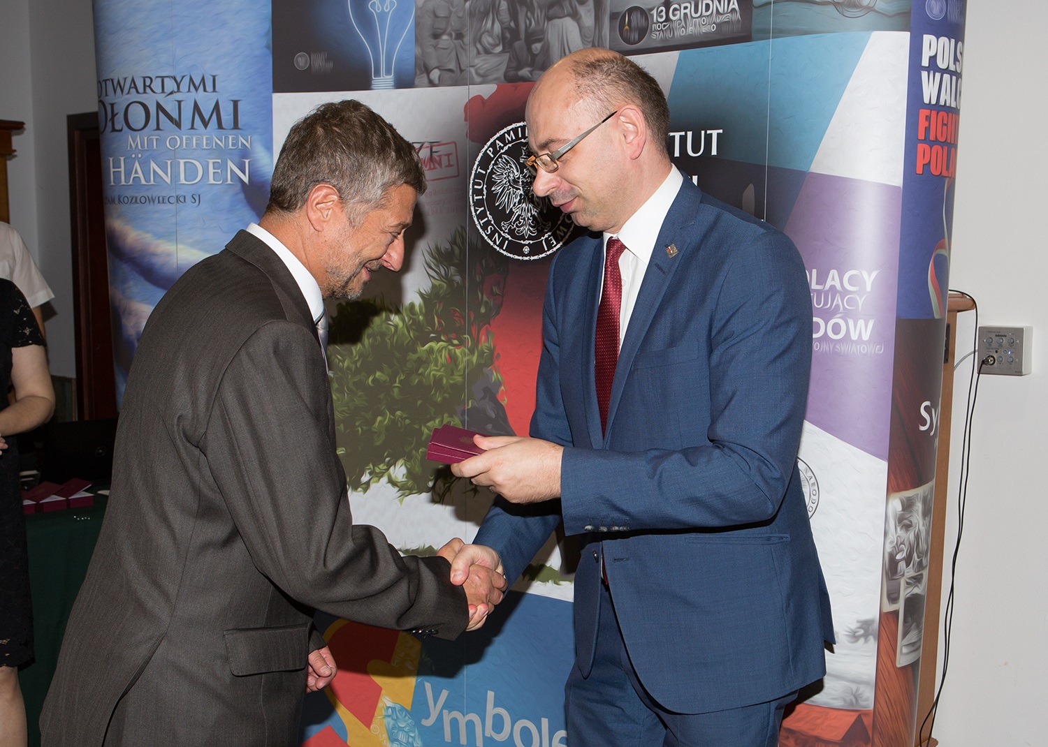 Dr Mateusz Szpytma wiceprezes IPN w imieniu prezydenta RP wręczył odznaczenie państwowe KWiS panu Marcinowi Janowi Hejnarowi. -