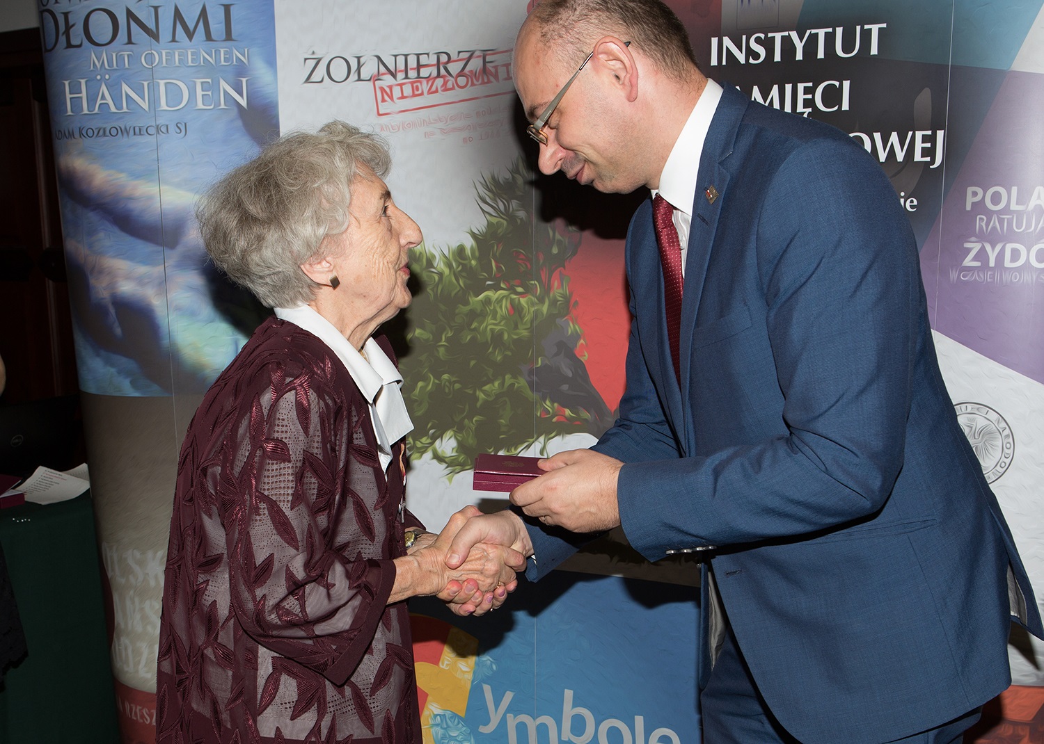 Dr Mateusz Szpytma wiceprezes IPN w imieniu prezydenta RP wręczył odznaczenie państwowe KWiS pani Irenie Granowskiej. -