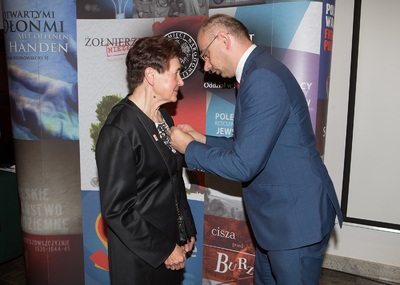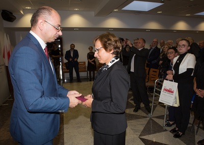 Dr Mateusz Szpytma wiceprezes IPN w imieniu prezydenta RP wręczył odznaczenie państwowe KWiS pani Barbarze Frączek. -