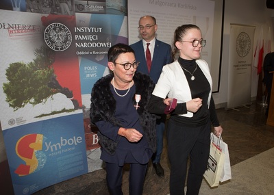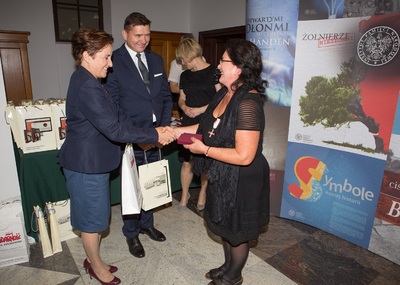 Dr Mateusz Szpytma wiceprezes IPN w imieniu prezydenta RP wręczył odznaczenie państwowe KWiS pani Małgorzacie Kotlińskiej. -