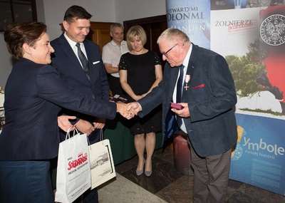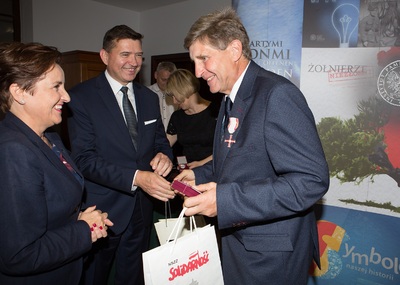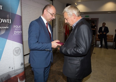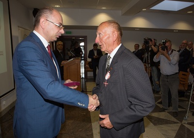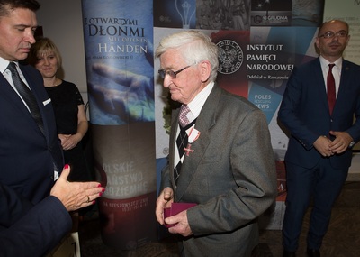 Dr Mateusz Szpytma wiceprezes IPN w imieniu prezydenta RP wręczył odznaczenie państwowe KWiS panu Januszowi Kujawie. -