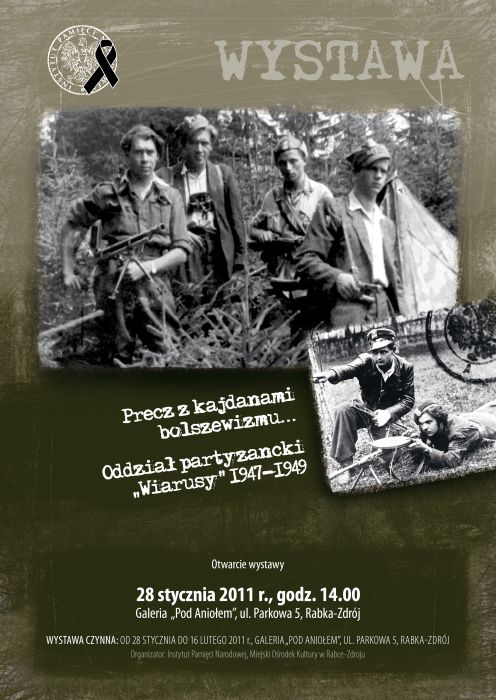 Oddział Instytutu Pamięci Narodowej w Krakowie oraz Miejski Ośrodek kultury w Rabce-Zdroju zapraszają na wystawę „Precz z kajdanami bolszewizmu... Oddział partyzancki »Wiarusy« 1947–1949”. Otwarcie wystawy miało miejsce 28 stycznia 2011 o godzinie 14.00 w Galerii Pod Aniołem w Rabce-Zdroju, ul. Parkowa 5. Ekspozycję zorganizowały krakowski oddział Instytutu Pamięci Narodowej oraz Miejski Ośrodek Kultury w Rabce-Zdroju. Będzie prezentowana do 16 lutego 2011. Wstęp wolny.