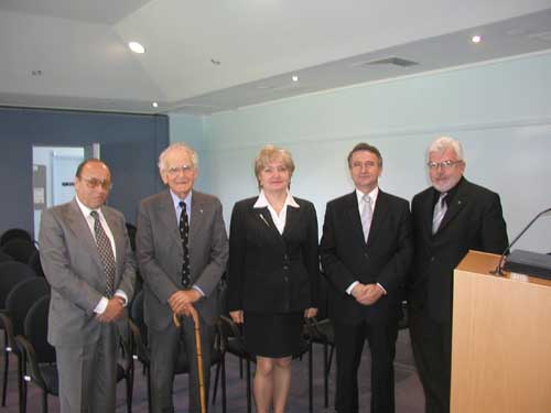 (od lewej) Andrew Bilski, prof. Jerzy Zubrzycki, Bogumiła Więcław, Prof. Leon Kieres, Aleksander Gancarz, National Europe Centre, Australian National University, Kanbera, 19.10.2004