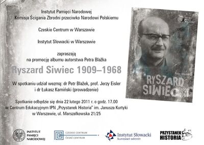 Dnia 22 lutego 2011 r. o godz. 17.00 w Centrum Edukacyjnym IPN „Przystanek Historia” im. Janusza Kurtyki w Warszawie, przy ul. Marszałkowskiej 21/25 odbyła się promocja albumu autorstwa Petra Blažka „Ryszard Siwiec, 1909–1968” wydanego przez Instytut Pamięci Narodowej.