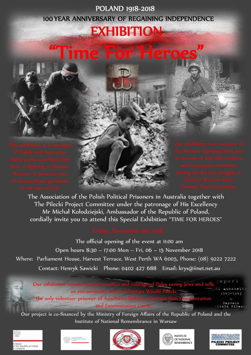 9 listopada w Parlamencie Australii Zachodniej w Perth ambasador RP w Canberze Michał Kołodziejski oraz zastępca prezesa IPN Jan Baster otworzyli uroczyście wystawę „Czas Bohaterów”. Na wystawę składają się cztery ekspozycje poświęcone odpowiednio rotmistrzowi Witoldowi Pileckiemu, Powstaniu Warszawskiemu, Radzie Pomocy Żydom „Żegota” i rodzinie Ulmów z Markowej. Dwie pierwsze są autorstwa Zarządu Komitetu Pilecki, dwie kolejne zaś – Instytutu Pamięci Narodowej. W obchodach udział wzięli gubernator Australii Zachodniej Kim Beazley i przewodnicząca Rady Legislacyjnej Parlamentu Australii Zachodniej Catherine Esther Doust oraz przedstawiciele korpusu dyplomatycznego akredytowanego w Perth.