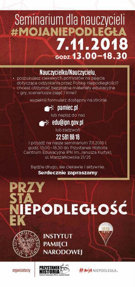 Kolejne propozycje prowadzenia zajęć szkolnych (od IV kl.) o Niepodległości dla nauczycieli humanistów przedstawią edukatorzy Biura Edukacji Narodowej IPN. To seminarium metodyczne będzie częścią Tygodnia Niepodległości w Centrum Edukacyjnym „Przystanek Historia” im. Janusza Kurtyki w Warszawie . Podczas spotkania przedstawimy materiały edukacyjne przygotowane przez IPN oraz pokażemy, w jaki sposób z nich korzystać. Osoby, które wezmą udział w całym seminarium, otrzymają pakiety edukacyjne oraz zaświadczenia udziału w szkoleniu.