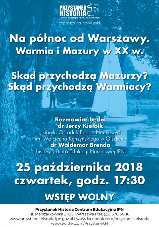 „Skąd przychodzą Mazurzy? Skąd przychodzą Warmiacy? Gdzie przebiegały granice geograficzne, etniczne, językowe i religijne w tym regionie?” – na te oraz inne pytania odpowiedzieli dr Waldemar Brenda i dr Jerzy Kiełbik podczas pierwszego spotkania z cyklu „Na północ od Warszawy. Warmia i Mazury w XX w.”. Spotkanie odbyło się 25 października na Przystanku Historia przy ul. Marszałkowskiej 21/25 w Warszawie.