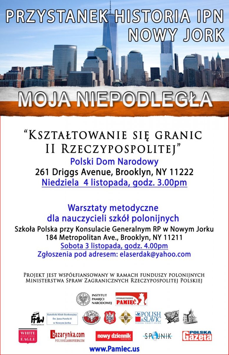 W niedzielę 4 listopada w Polskim Domu Narodowym w Nowym Jorku przy 261 Driggs Ave, Brooklyn, NY 11222 odbyło się jedyne otwarte spotkanie podczas Przystanku Historia na temat: „Kształtowanie się granic II Rzeczpospolitej”. Prelekcję wygłosili pracownicy Instytutu Pamięci Narodowej Barbara Pamrów i Magdalena Bogdan.