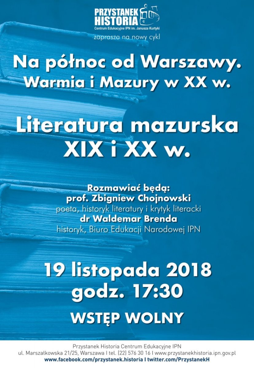 O literaturze mazurskiej XIX i XX w. rozmawiali prof. Zbigniew Chojnowski – poeta, historyk literatury i krytyk literacki i dr Waldemar Brenda – historyk, zastępca dyrektora Biura Edukacji Narodowej IPN.