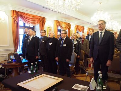 Konferencję rozpoczęło – tradycyjne już w Bełchatowie – odśpiewanie Marszu I Brygady, a następnie uroczystość wręczenia Prezesowi IPN dr. Jarosławowi Szarkowi pamiątkowego pozłacanego obrazu orła białego przez przedstawicieli Jednostki Strzeleckiej 2036 im. Oddziału Partyzanckiego Armii Krajowej „Błysk” z Paradyża.