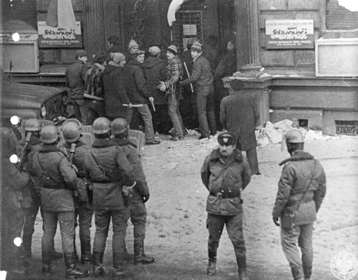 Milicja przygotowuje się do zajęcia siedziby Zarządu Regionu łódzkiej „Solidarności”, 13 grudnia 1981 r. IPN Ld 633/25 -