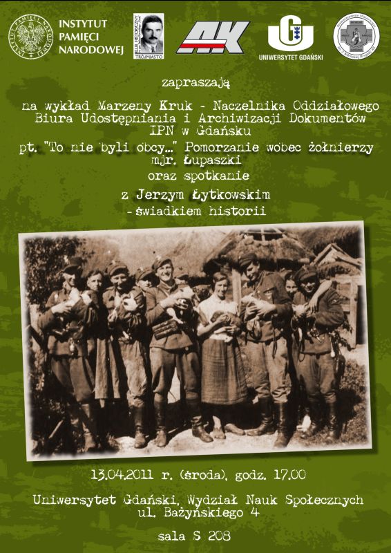 13 kwietnia br. na Wydziale Nauk Społecznych Uniwersytetu Gdańskiego (ul. Baczyńskiego 4 w Gdańsku) popularnonaukowy wykład „»To nie byli obcy…« Pomorzanie wobec żołnierzy mjr. Łupaszki” wygłosiła Marzena Kruk, naczelnik pionu archiwalnego gdańskiego oddziału IPN. Na spotkaniu, zorganizowanym w ramach działalności trójmiejskiego Klubu Historycznego im. gen. Stefana Roweckiego „Grota” (Klub afiliowany jest przy gdańskim oddziale IPN), wystąpił także Jerzy Łytkowski, świadek historii.