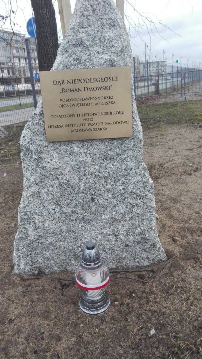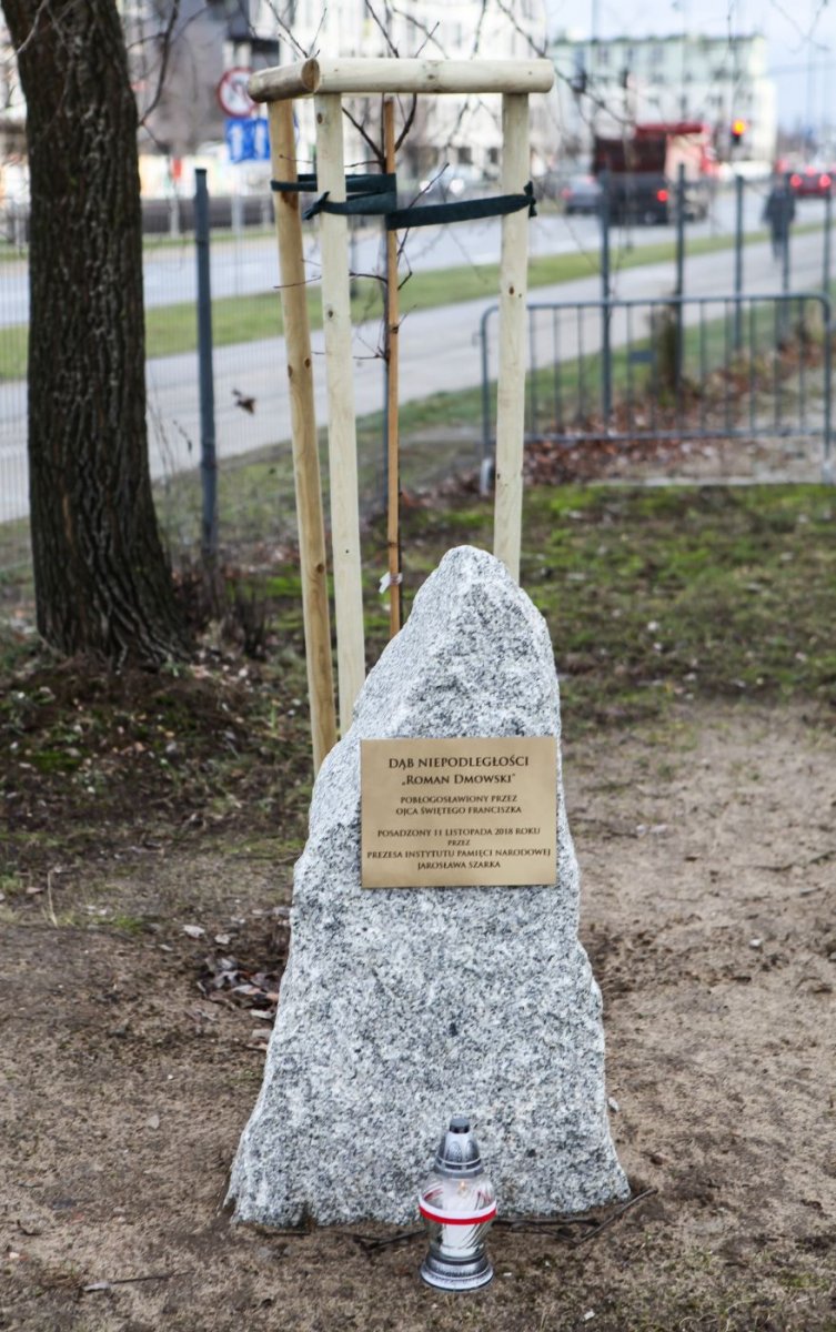 Dąb Niepodległości upamiętniający Romana Dmowskiego zasadzony przy Świątyni Opatrzności Bożej 11 listopada 2018 -