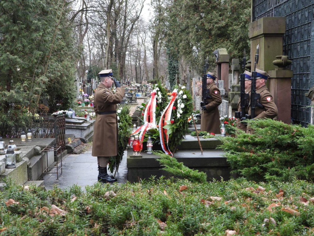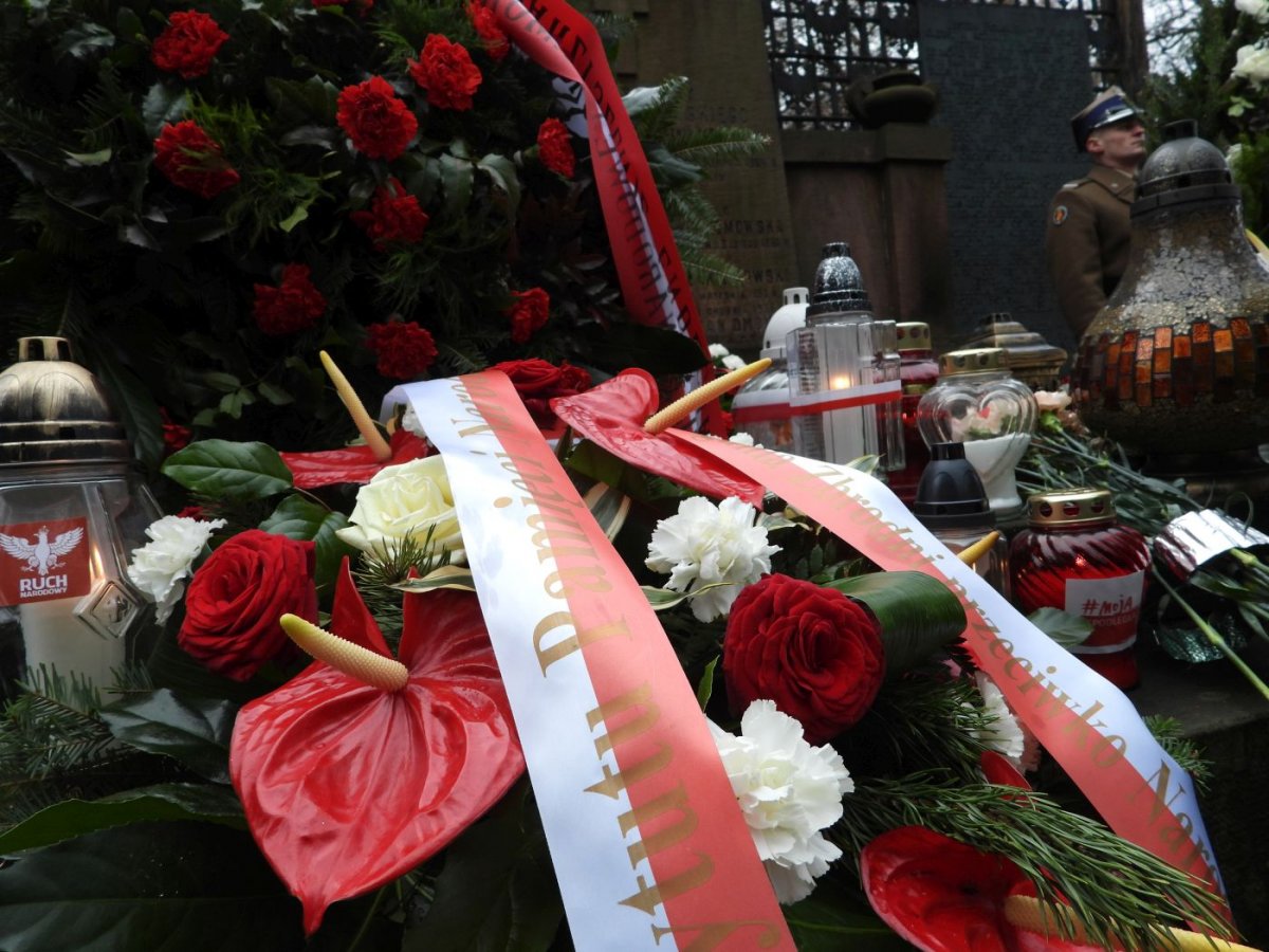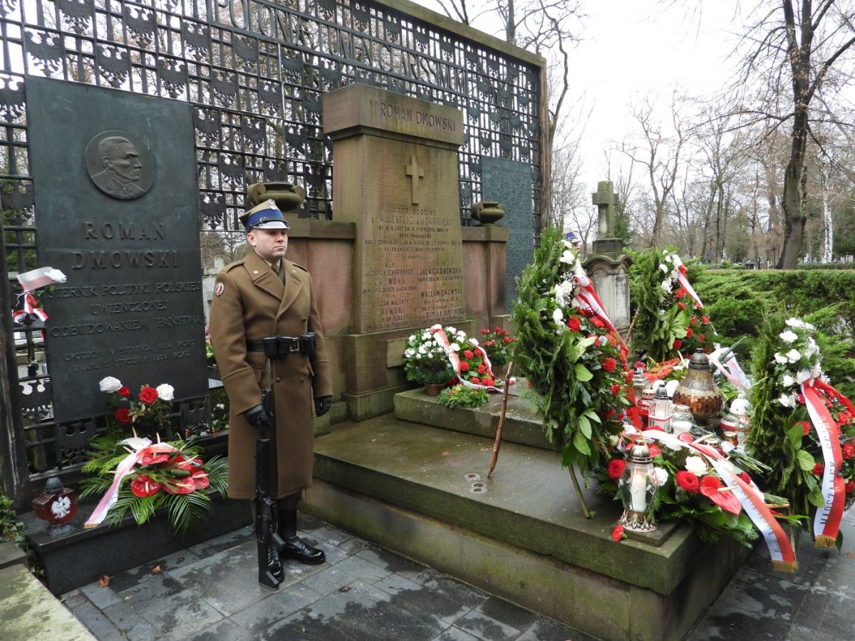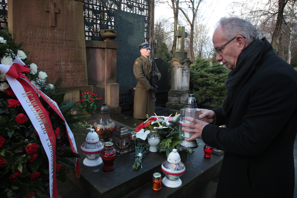 Prezes IPN Jarosław Szarek przy grobie Romana Dmowskiego na Cmentarzu Bródnowskim -