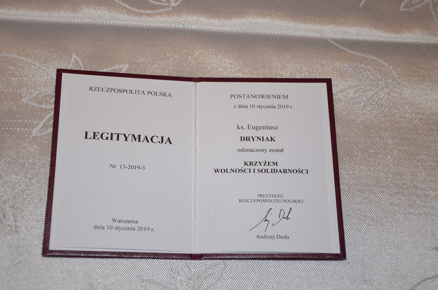 11 stycznia 2019 r. w Nowym Zagórzu odbyła się uroczystość wręczenia Krzyża Wolności i Solidarności za działalność opozycyjną dla ks. prałata Eugeniusza Dryniaka. W imieniu Prezydenta Rzeczypospolitej Polskiej aktu dekoracji dokonał marszałek Sejmu RP Marek Kuchciński. Akt nadania odznaczenia odczytał naczelnik Oddziałowego Archiwum IPN Dariusz Byszuk. W tej uroczystej chwili ks. Dryniakowi towarzyszyli koledzy z czasów podziemnej działalności: Michał Stręk, Stanisław Łakomy, Zbigniew Sieczkoś, Marek Żminkowski, starosta sanocki Stanisław Chęć, wicestarosta Janusz Cecuła, burmistrz Miasta i Gminy Zagórz Ernest Nowak, dr Mariusz Krzysztofiński z IPN Oddział w Rzeszowie, dyrektor Muzeum Narodowego Ziemi Przemyskiej Jan Jarosz i przyjaciele.