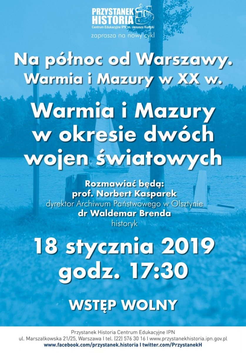 „Warmia i Mazury w okresie dwóch wojen światowych” to tytuł kolejnej rozmowy z cyklu „Na północ od Warszawy. Warmia i Mazury w XX w.”. Spotkanie odbyło się 18 stycznia (piątek) w Centrum Edukacyjnym IPN „Przystanek Historia” przy ul. Marszałkowskiej 21/25 w Warszawie. Gościem dr. Waldemara Brendy był prof. Norbert Kasparek, dyrektor Archiwum Państwowego w Olsztynie.