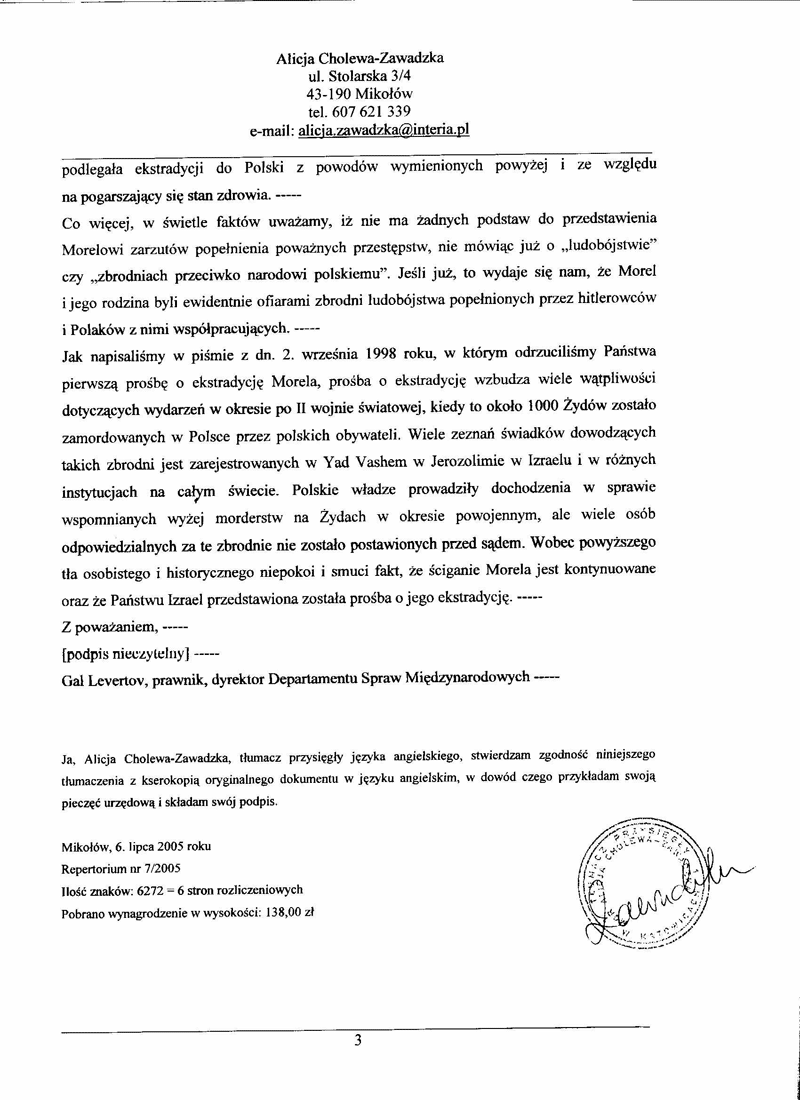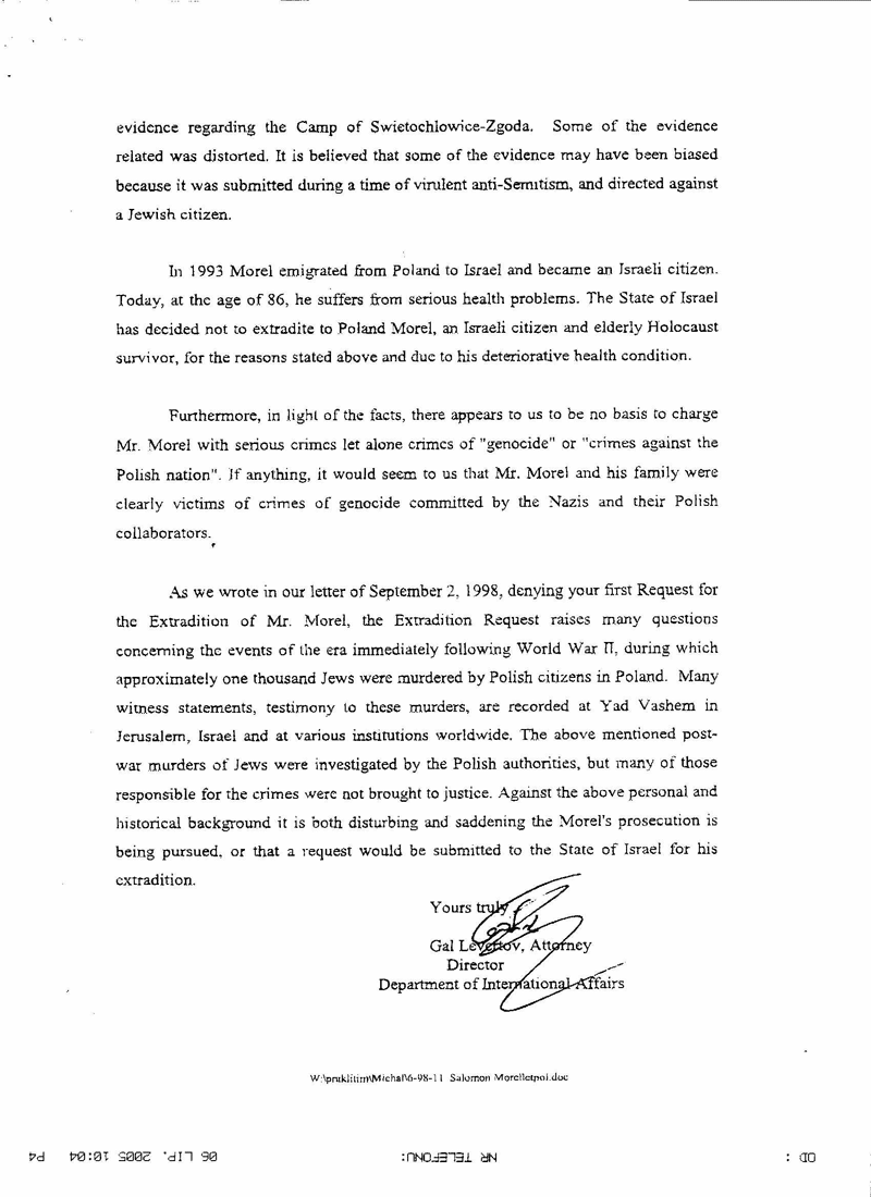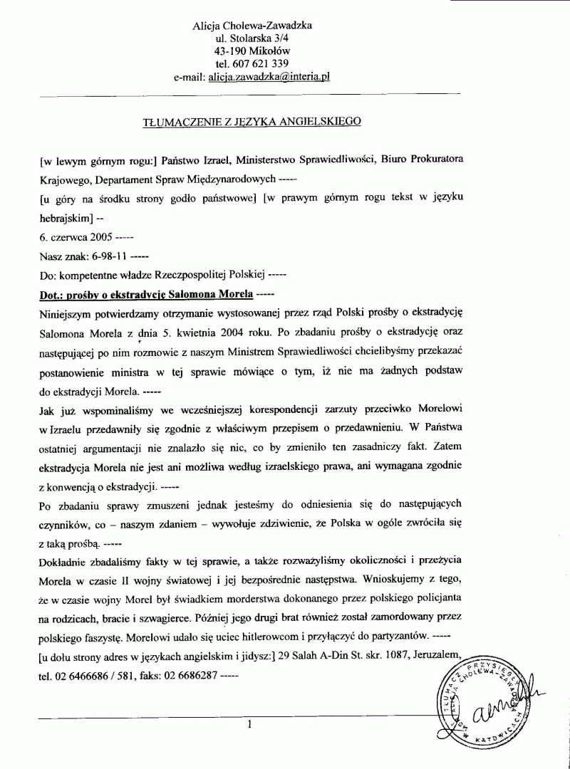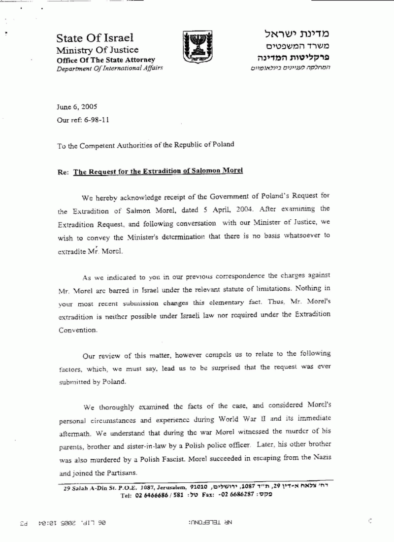 Odpowiedź Państwa Izrael na wniosek o ekstradycję Salomona Morela