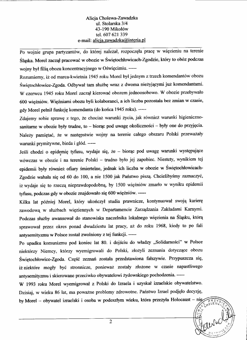 [6] List Salomona Morela do Okręgowej Komisji Badania Zbrodni przeciwko Narodowi Polskiemu w Katowicach z 7 XI 1992, IPN Ka, Akta śledztwa..., k. 78-81, zob. także Obóz Pracy w Świętochłowicach w 1945 roku. Dokumenty, zeznania, relacje, listy, wybór, wstęp i oprac. A. Dziurok, Warszawa 2002, s. 89-92.