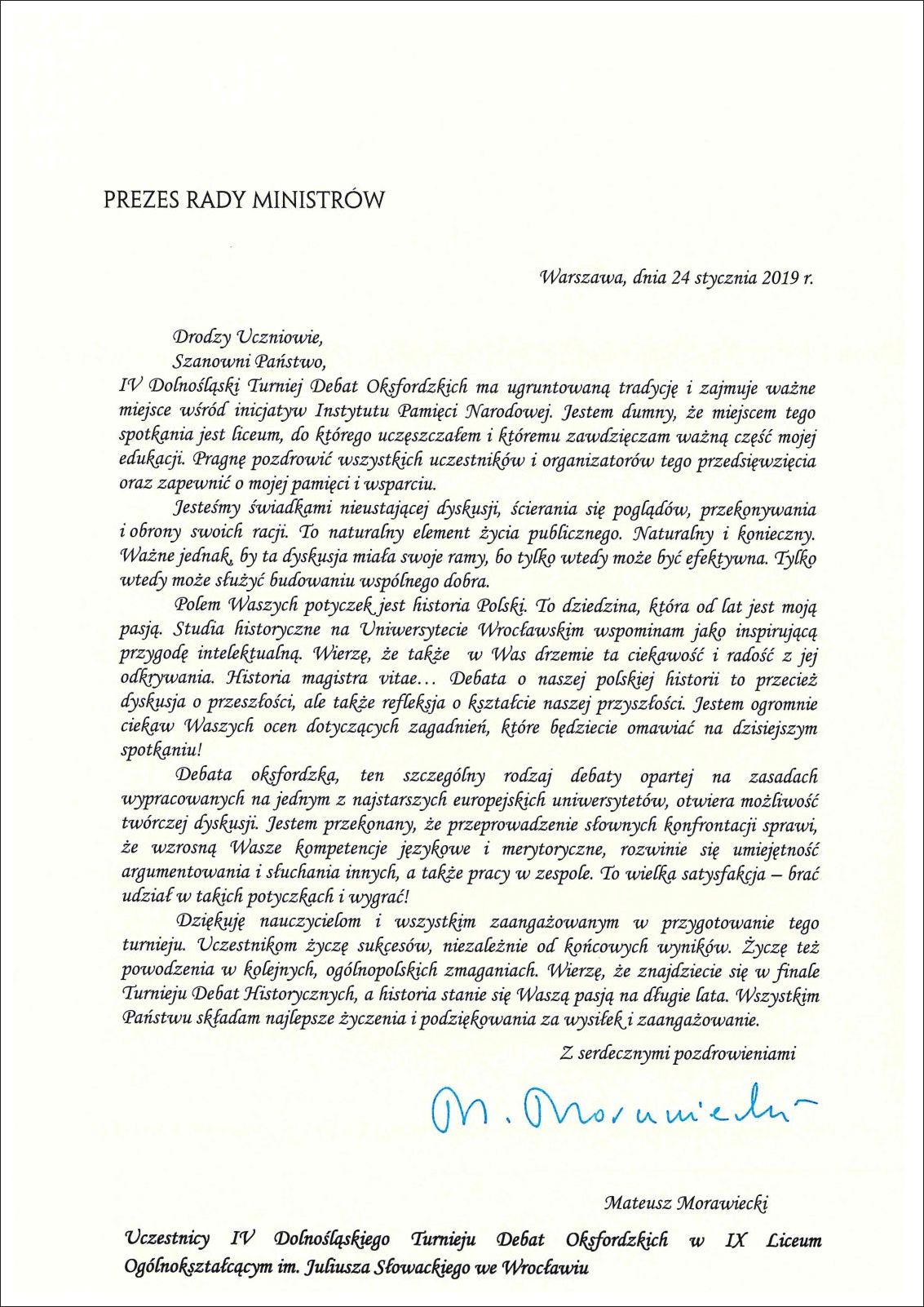 IV Dolnośląski Turniej Debat Oksfordzkich jako ważna inicjatywa o ugruntowanej tradycji, został dostrzeżony i wyróżniony przez Prezesa Rady Ministrów Pana Mateusza Morawieckiego, który skierował do uczestników Turnieju list. List został odczytany podczas uroczystego otwarcia Turnieju.