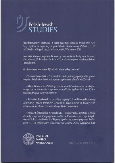 Do „Biuletynu IPN” dołączyliśmy recenzję dr. Tomasza Domańskiego „Korekta obrazu? Refleksje źródłoznawcze wokół książki Dalej jest noc. Losy Żydów w wybranych powiatach okupowanej Polski”. Przedmiotem opracowania jest publikacja Dalej jest noc. Losy Żydów w wybranych powiatach okupowanej Polski (t. 1-2) pod red. Barbary Engelking i Jana Grabowskiego. Artykuł dr. Tomasza Domańskiego jest pierwszym z serii recenzji przygotowywanych przez IPN na temat książki. Powstał w wyniku licznych zapytań osób zainteresowanych tą tematyką skierowanych do IPN. Recenzja „Korekta obrazu?” stanowi jednocześnie zapowiedź nowego czasopisma IPN „Polish-Jewish Studies”.