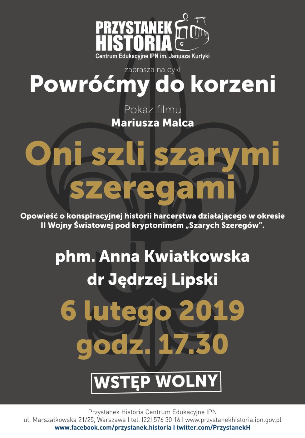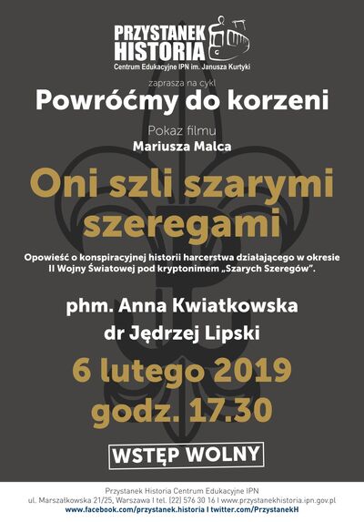 6 lutego 2019 roku w Centrum Edukacyjnym IPN „Przystanek Historia” odbyło się spotkanie z cyklu „Powróćmy do korzeni”. Zaprezentowany został film Mariusza Malca „Oni szli szarymi szeregami”. Gościem spotkania była podharcmistrzyni Anna Kwiatkowska, poprowadził je dr Jędrzej Lipski.