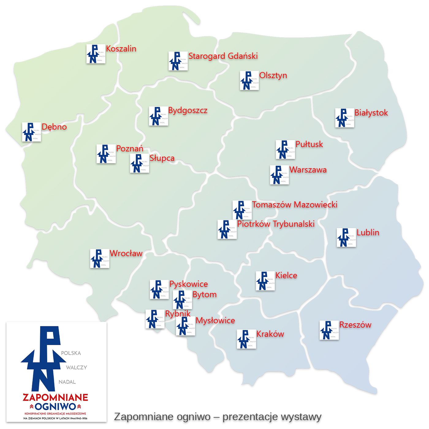Miejsca prezentacji wystawy „Zapomniane Ogniwo. Konspiracyjne organizacje młodzieżowe na ziemiach polskich w latach 1944/45–1956”