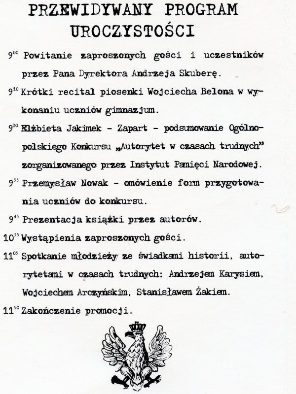 W Samorządowym Gimnazjum nr 1 w Busku-Zdroju miała miejsce promocja książki „Autorytet w czasach trudnych”, zawierającej prace uczniów gimnazjum: Mateusza Lewandowskiego, Dominiki Paw i Weroniki Polak, laureatów etapu ogólnopolskiego konkursu tematycznego „W kalejdoskopie pamięci – Polska i Polacy w latach 1939–1989. Autorytet w czasach trudnych”, organizowanego przez Biuro Edukacji Publicznej Instytutu Pamięci Narodowej na zlecenie Mazowieckiego Kuratora Oświaty. Podsumowania dokonała Elżbieta Jakimek-Zapart, pracownik Referatu Edukacji Historycznej Oddziałowego Buira Edukacji Publicznej w Krakowie, koordynator regionalny konkursu.