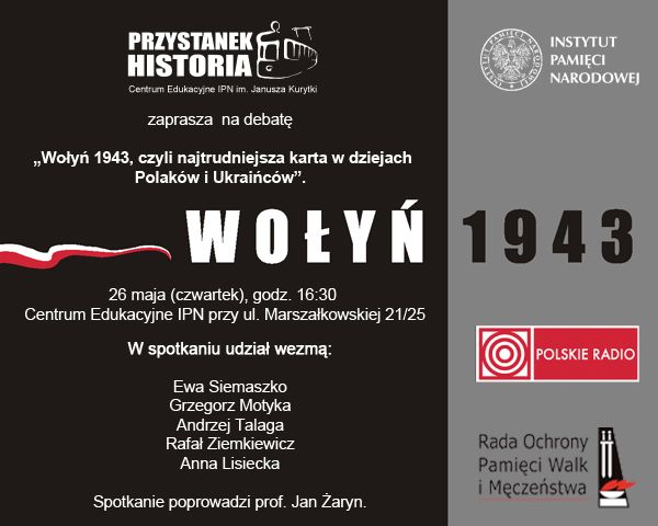 26 maja (czwartek) w Centrum Edukacyjnym IPN Przystanek Historia przy ul. Marszałkowskiej 21/25 w Warszawie odbyła się debata „Wołyń 1943, czyli najtrudniejsza karta w dziejach Polaków i Ukraińców”. W spotkaniu udział wzięli: Ewa Siemaszko, Grzegorz Motyka, Andrzej Talaga, Rafał Ziemkiewicz i Anna Lisiecka. Debatę poprowadził prof. Jan Żaryn.