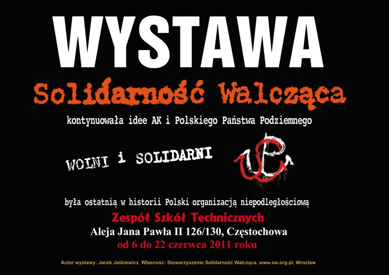 W dniach 7–22 czerwca 2011 r. Zespole Szkół Technicznych w Częstochowie (al. Jana Pawła II 126/130) jest prezentowana wystawa „Wolni i solidarni”, przygotowana przez wrocławskie Stowarzyszenie Solidarność Walcząca. Organizatorem prezentacji wystawy jest Oddział Instytutu Pamięci Narodowej w Katowicach.
