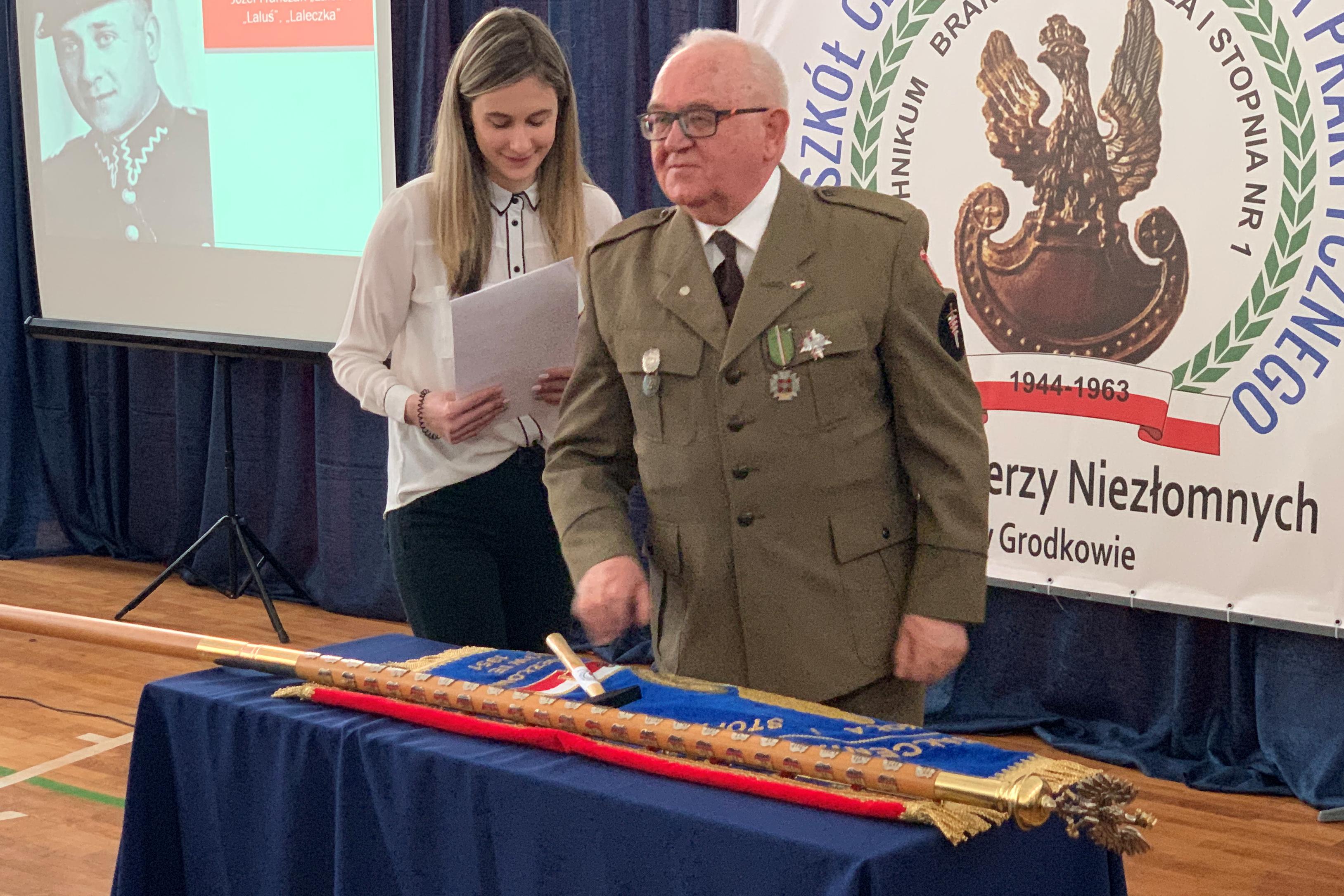 Patron szkoły ściśle związany jest z wydarzeniami, jakie miały miejsce wiosną 2016 r. Wówczas Zespół Poszukiwawczy IPN pod kierownictwem prof. Krzysztofa Szwagrzyka odkrył na polanie opodal Grodkowa szczątki 30 żołnierzy NSZ ze Zgrupowania Oddziałów Leśnych pod dowództwem kpt. Henryka Flamego „Bartka”, którzy ponieśli śmierć we wrześniu 1946 r. na skutek prowokacyjnej akcji MBP, znanej szerzej jako operacja „Lawina”. Instytut Pamięci Narodowej od samego początku wspierał merytorycznie starania dyrekcji szkoły o nadanie placówce patrona im. „Żołnierzy Niezłomnych”, a oddział Wrocławski IPN był współfundatorem sztandaru. Oprócz uczniów i grona pedagogicznego, na uroczystości obecni byli przedstawiciele władz samorządowych z Wojewodą Opolskim, Adrianem Czubakiem, delegacja Instytutu Pamięci Narodowej z wiceprezesem prof. Krzysztofem Szwagrzykiem na czele, oraz przedstawiciele rodzin partyzanckich. Goście najbardziej zaangażowani w sprawę nadania szkole patrona i ufundowania sztandaru zostali wyróżnieni symbolicznym przybiciem gwoździa do drzewca oraz wpisaniem się do okolicznościowej Księgi Pamiątkowej. Ze strony Instytutu Pamięci Narodowej zaszczytu tego dostąpili wiceprezes IPN prof. Krzysztof Szwagrzyk, dr Bartosz Kuświk, naczelnik Delegatury Opolskiej IPN oraz dr Tomasz Greniuch, pracownik Delegatury Opolskiej IPN i autor licznych prac dotyczących historii Zgrupowania NSZ kpt. „Bartka”. Do zebranych przemówili m.in. Dyrektor szkoły, pani Danuta Trzaskawska, Wojewoda Opolski Adrian Czubak i wiceprezes IPN prof. Krzysztof Szwagrzyk.