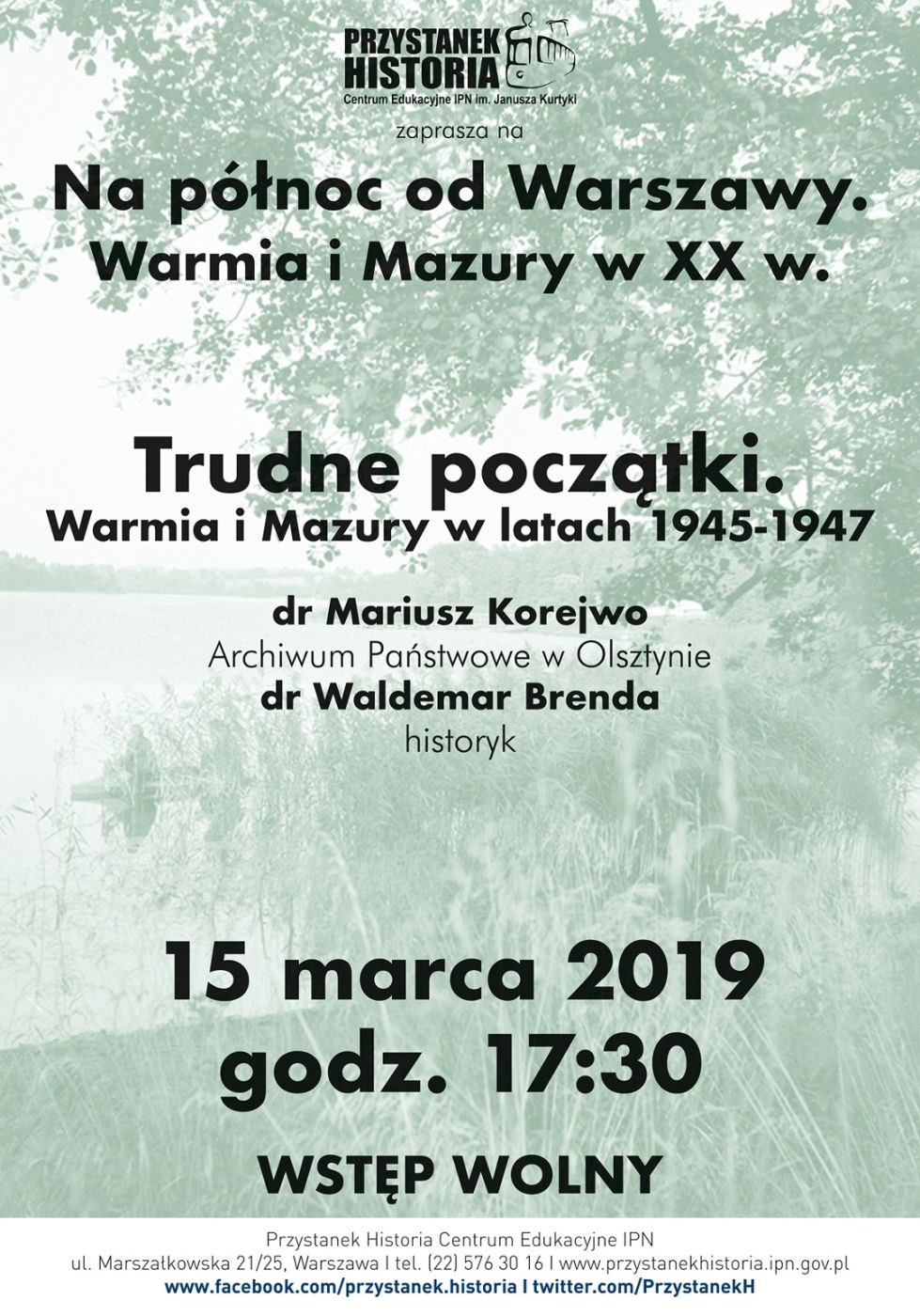 15 marca 2019 r., w Centrum Edukacyjnym IPN „Przystanek Historia” im. Janusza Kurtyki w Warszawie, odbyła się dyskusja „Trudne początki. Warmia i Mazury w latach 1945–1947 ” z cyklu „Na północ od Warszawy. Warmia i Mazury w XX w.”. Gościem dr. Waldemara Brendy był dr Mariusz Korejwo z Archiwum Państwowego w Olsztynie.