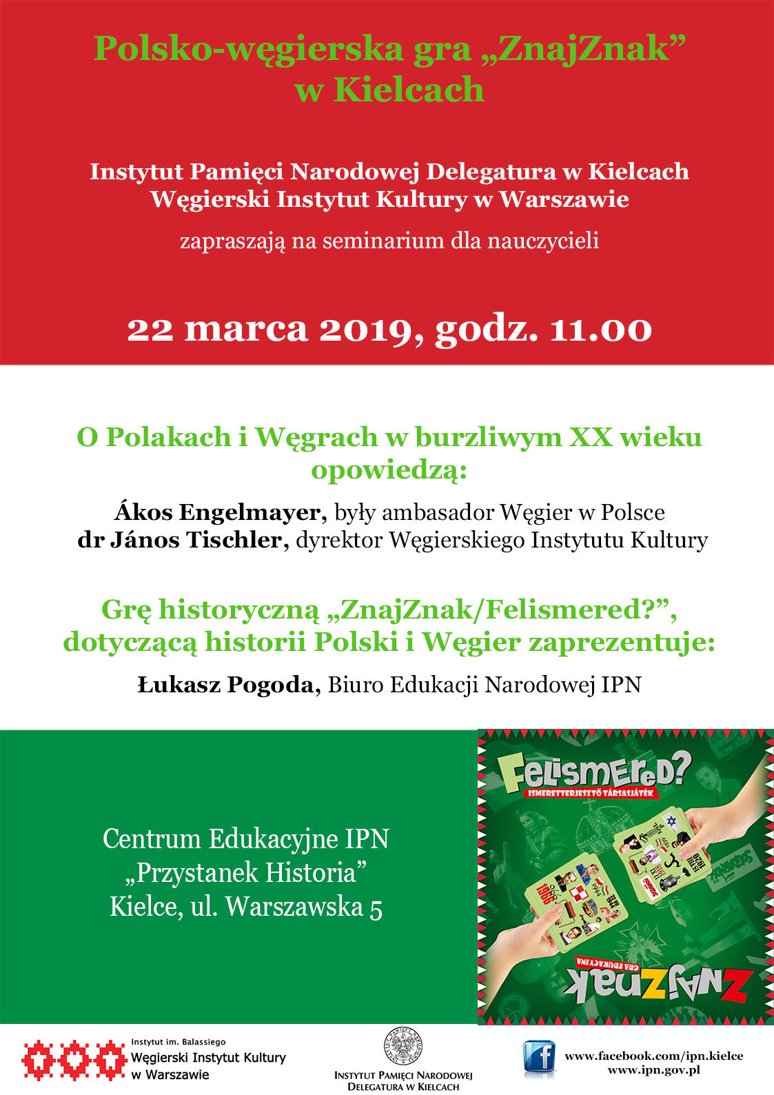 W ramach obchodów Dni Przyjaźni Polsko-Węgierskiej, 22 marca 2019 r., w Centrum Edukacyjnym „Przystanek Historia” IPN w Kielcach, odbyło się seminarium dla nauczycieli poświęcone historii polsko-węgierskiej.