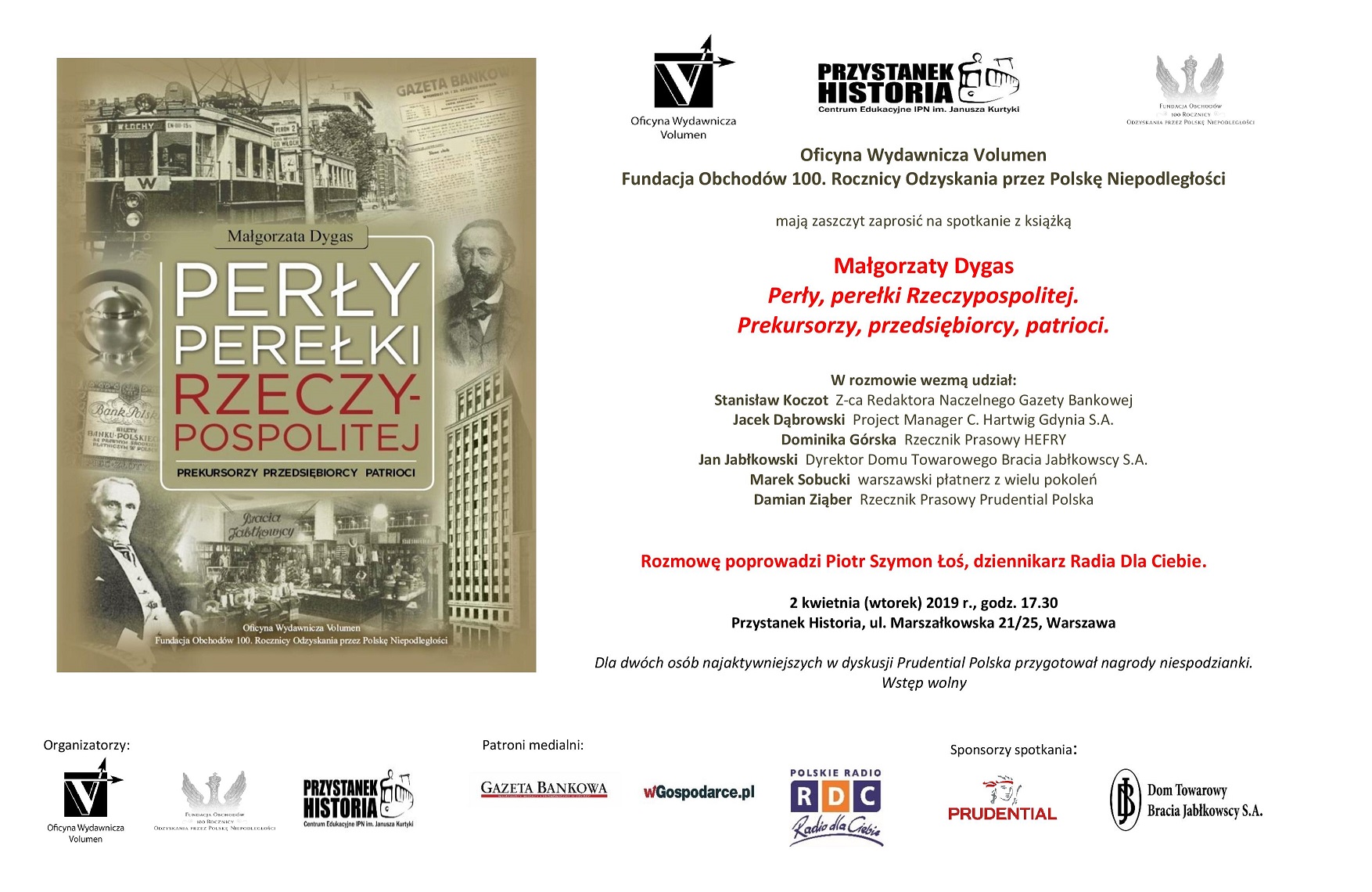 2 kwietnia 2019 roku, w Centrum Edukacyjnym IPN im. Janusza Kurtyki „Przystanek Historia”, przy ul. Marszałkowskiej 21/25 w Warszawie odbyła się prezentacja książki Małgorzaty Dygas Perły, perełki Rzeczypospolitej. Prekursorzy, przedsiębiorcy, patrioci. Spotkanie zorganizowały Oficyna Wydawnicza Volumen i Fundacja Obchodów 100. Rocznicy Odzyskania przez Polskę Niepodległości.