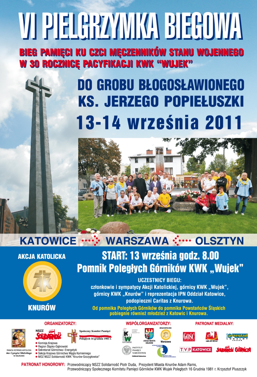 13 września 2011 r. o godz. 8.00 pod pomnikiem Poległych Górników KWK „Wujek” w Katowicach rozpoczął się Bieg Pamięci ku czci męczenników stanu wojennego w 30. rocznicę pacyfikacji KWK „Wujek”. Uczestnicy sztafety pobiegli w dn. 13–14 września 2011 r. do grobu bł. ks. Jerzego Popiełuszki. VI pielgrzymka biegowa została zorganizowana przez parafię pw. św. Cyryla i Metodego w Knurowie, Społeczny Komitet Pamięci Poległych 16 grudnia 1981 r. oraz NSZZ „Solidarność”, przy współpracy z Oddziałem Instytutu Pamięci Narodowej w Katowicach. W biegu wzięli udział również pracownicy Oddziału Instytutu Pamięci Narodowej w Katowicach.