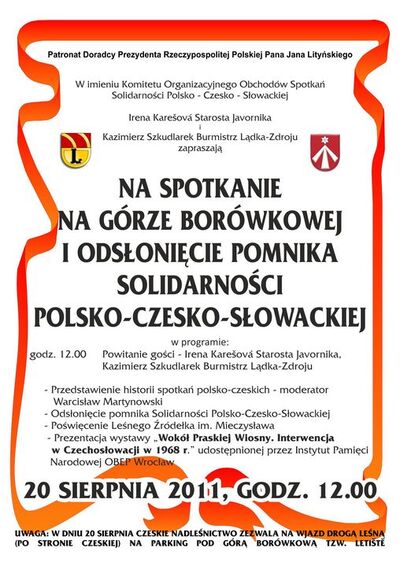 Organizatorami uroczystości są: Komitet Organizacyjny Obchodów Spotkań Solidarności Polsko-Czesko-Słowackiej, Starosta Javornika – Irena Karešová oraz Burmistrz Lądka-Zdroju – Kazimierz Szkudlarek. Patronat nad wydarzeniem objął Doradca Prezydenta Rzeczypospolitej Polskiej – Jan Lityński.