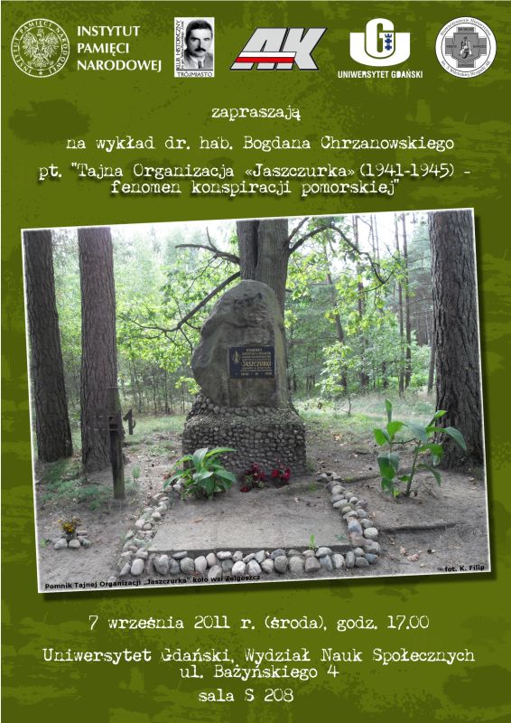 7 września br. na Wydziale Nauk Społecznych Uniwersytetu Gdańskiego (ul. Baczyńskiego 4 w Gdańsku) dr hab. Bogdan Chrzanowski, profesor Uniwersytetu Gdańskiego w Instytucie Politologii, wygłosił popularnonaukowy wykład „Tajna Organizacja »Jaszczurka« (1941–1945) – fenomen pomorskiej konspiracji”.