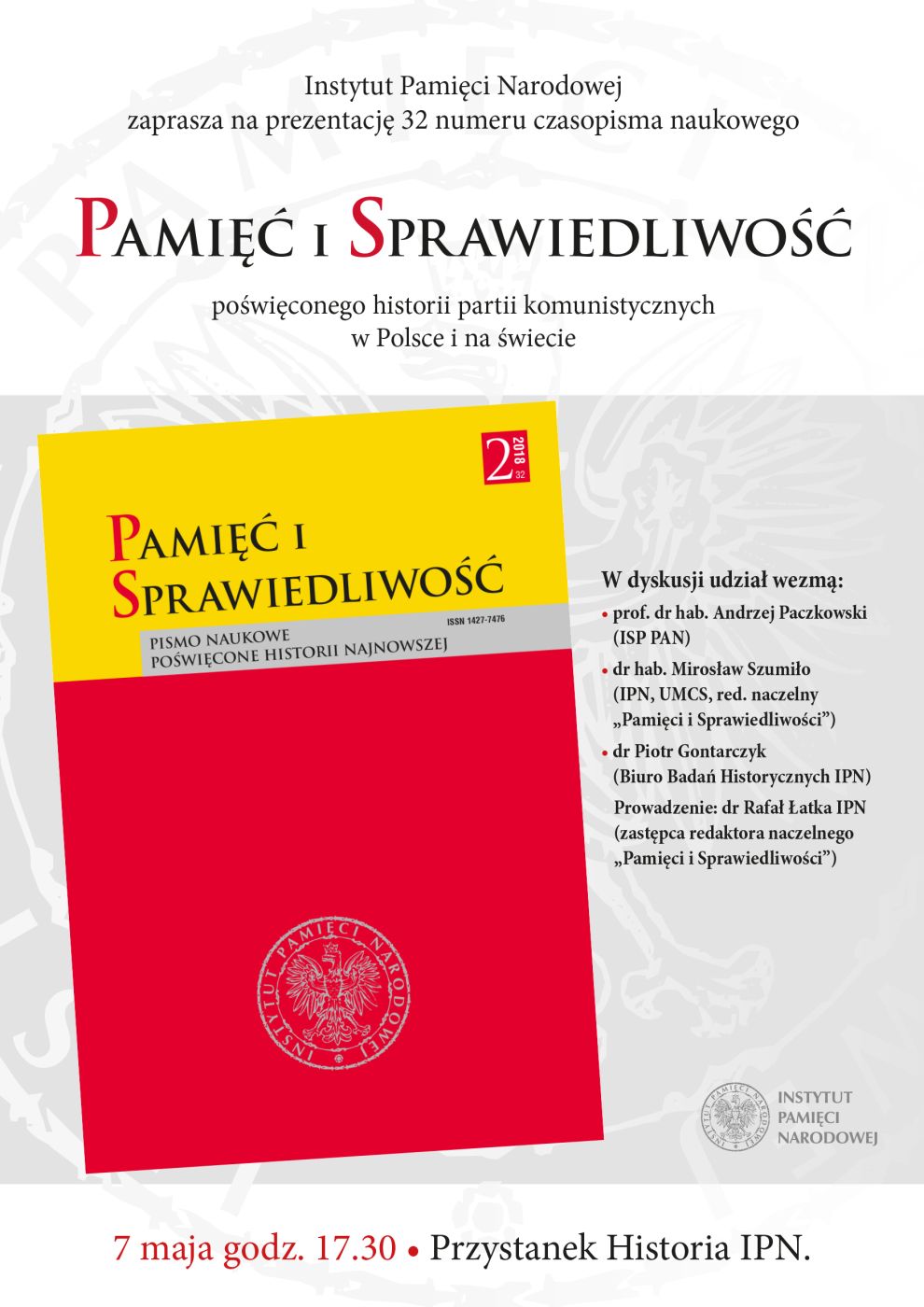 7 maja 2019, w Centrum Edukacyjnym IPN im. Janusza Kurtyki „Przystanek Historia”, przy ul. Marszałkowskiej 21/25 w Warszawie, odbyła się prezentacja 32 numeru czasopisma naukowego „Pamięć i Sprawiedliwość”, poświęconego historii partii komunistycznych w Polsce i na świecie.