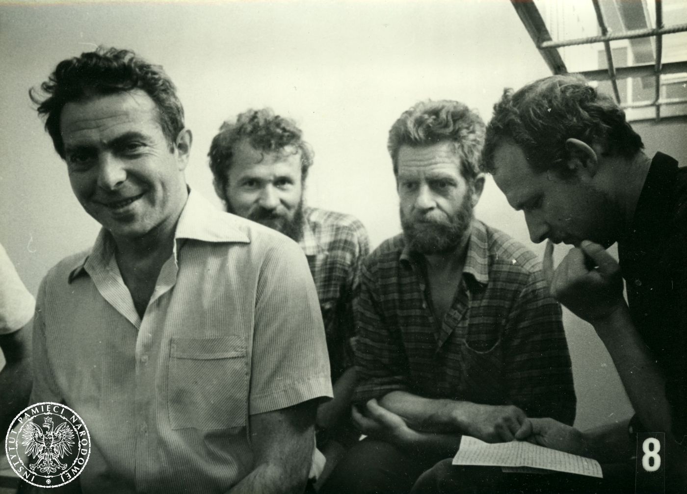 Internowani w Areszcie Śledczym Warszawa-Białołęka, 1982 r. Od lewej: Karol Modzelewski, Henryk Wujec, Andrzej Gwiazda, Adam Michnik (IPNBU-3-15-31-8) -