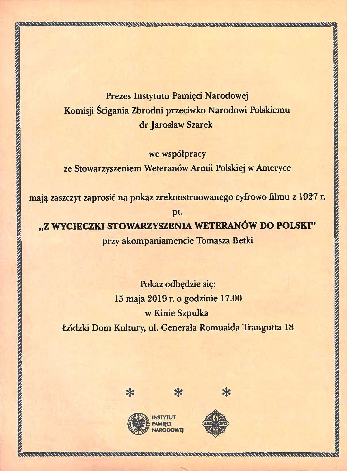 Projekcji filmu niemego „Z wycieczki Stowarzyszenia Weteranów do Polski” towarzyszył akompaniament fortepianowy Tomasza Betki, a także prezentacja wystawy ze skanami z filmu SWAP z 1927 r.