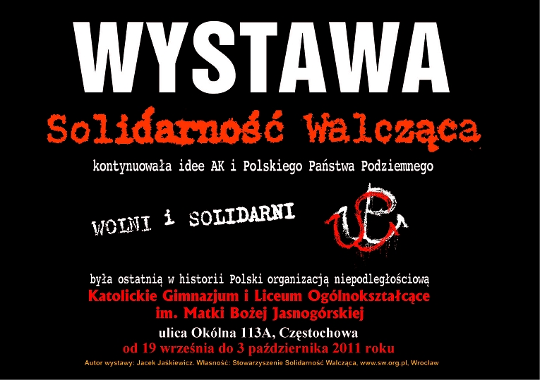 W dniach od 19 września do 3 października 2011 r. w Katolickim Gimnazjum i Liceum Ogólnokształcącym im. Matki Bożej Jasnogórskiej w Częstochowie (ul. Okólna 113 A) jest prezentowana wystawa „Wolni i Solidarni”, przygotowana przez Jacka Jaśkiewicza z wrocławskiego Stowarzyszenia Solidarność Walcząca. Organizatorem prezentacji wystawy jest Oddział Instytutu Pamięci Narodowej w Katowicach wraz ze Stowarzyszeniem Solidarność Walcząca we Wrocławiu.
