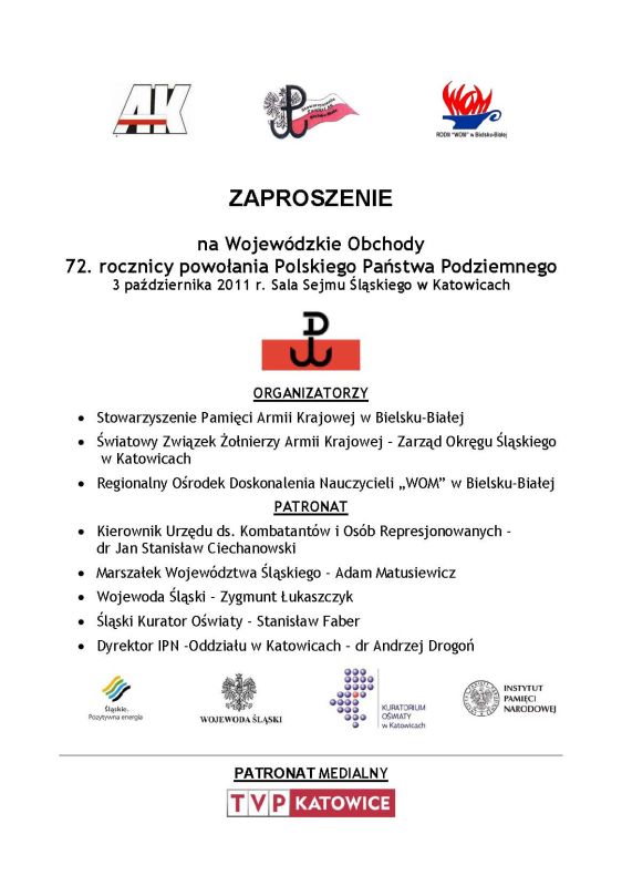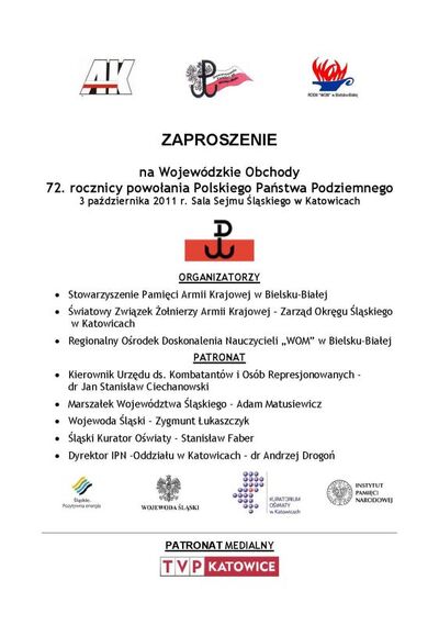 3 października 2011 r. w Sali Sejmu Śląskiego Urzędu Wojewódzkiego w Katowicach, przy ul. J. Ligonia 46, odbyły się obchody 72. rocznicy powołania Polskiego Państwa Podziemnego. Organizatorami uroczystości są: Stowarzyszenie Pamięci Armii Krajowej w Bielsku-Białej, Światowy Związek Żołnierzy Armii Krajowej – Zarząd Okręgu Śląskiego w Katowicach oraz Regionalny Ośrodek Doskonalenia Nauczycieli „WOM” w Bielsku-Białej. Obchody odbywały się pod patronatem Oddziału Instytutu Pamięci Narodowej w Katowicach.