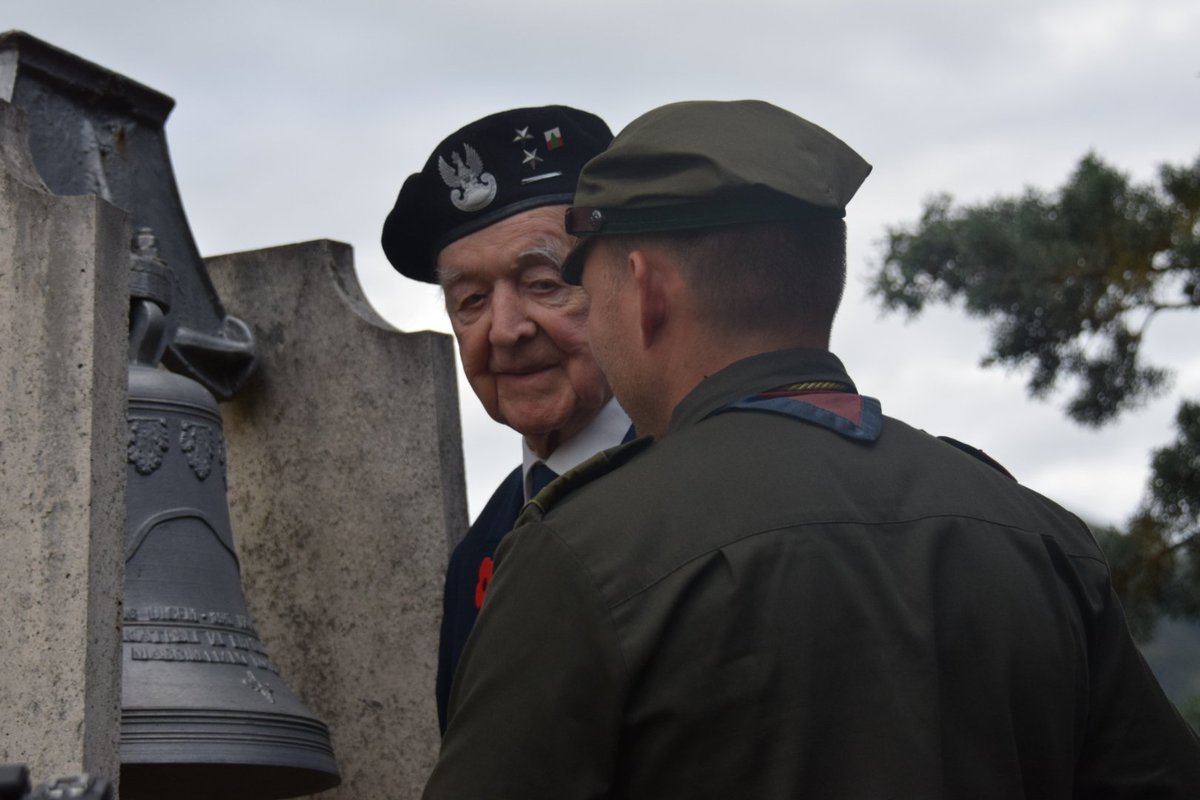 Ppor. Alfons Mrzyk, weteran walk o Monte Cassino, w asyście harcerza uderzył w dzwon na zakończenie uroczystości, 16 maja 2019 (fot. UdsKiOR) -