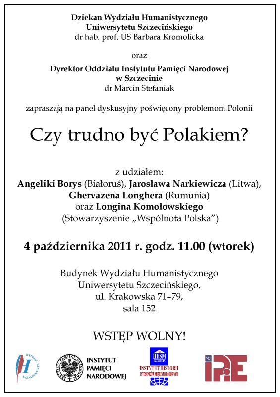 Szczeciński Oddział Instytutu Pamięci Narodowej oraz Wydział Humanistyczny Uniwersytetu Szczecińskiego zorganizowały panel dyskusyjny poświęcony problemom Polonii pt. „Czy trudno być Polakiem?” z udziałem Angeliki Borys (Białoruś), Jarosława Narkiewicza (Litwa), Ghervazena Longhera (Rumunia) oraz Longina Komołowskiego (Prezes Stowarzyszenia „Wspólnota Polska”).
