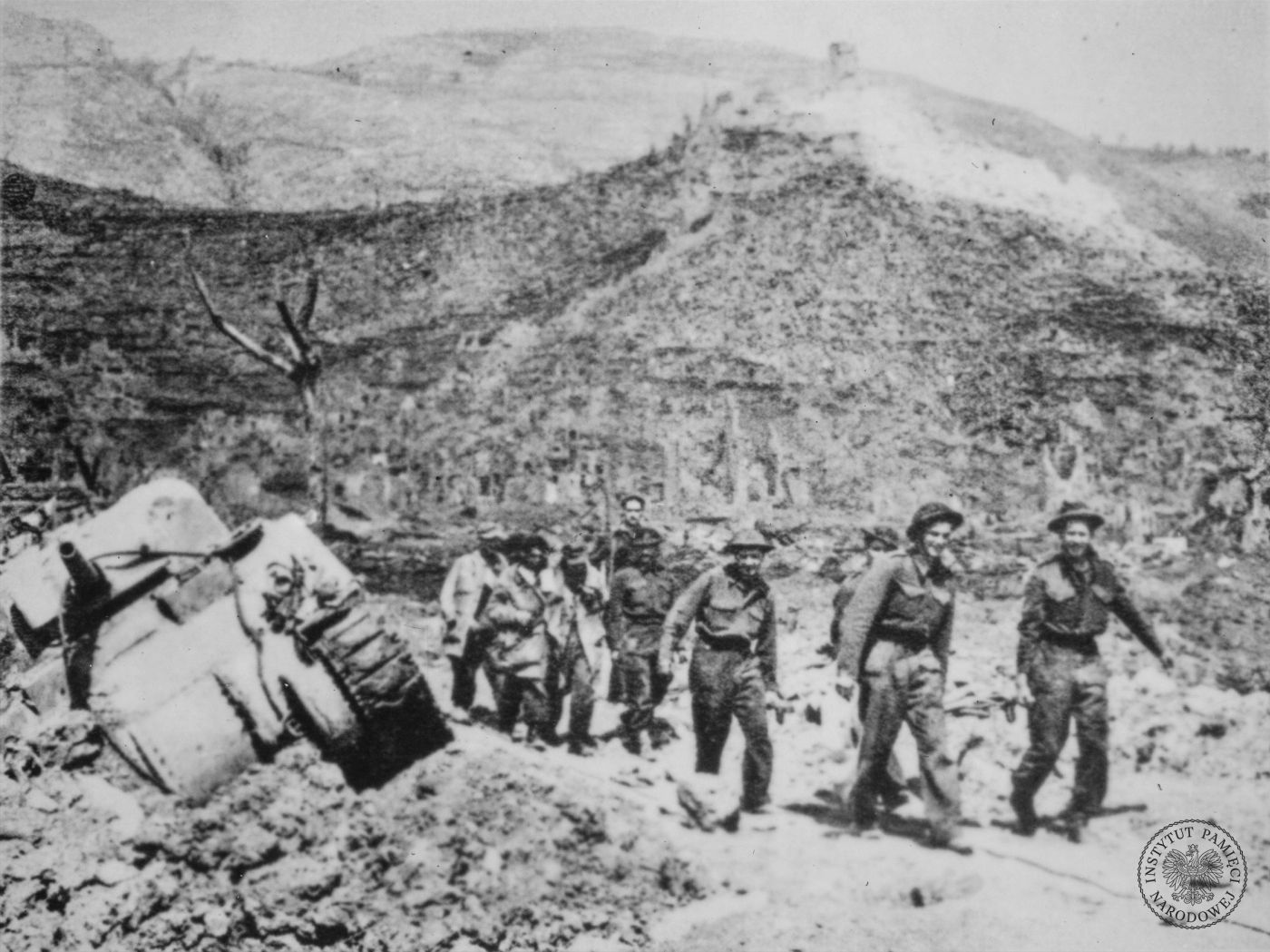 1. Polscy żołnierze niosą i prowadzą rannych. Na drugim planie klasztor na Monte Cassino.