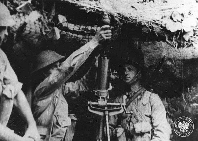 5. Obsługa polskiego moździerza (3-calowego) w jednej z jednostek 2 Korpusu Polskiego podczas prowadzenia ostrzału na zamaskowany stanowisku ogniowym