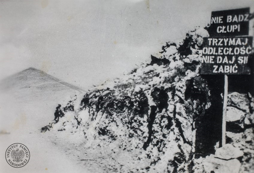 12. Tablice z ostrzeżeniami: NIE BĄDŹ GŁUPI. TRZYMAJ ODLEGŁOŚĆ, NIE DAJ SIĘ ZABIĆ.